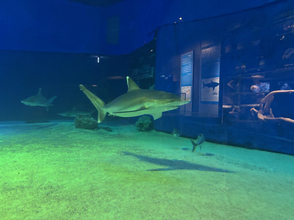 美ら海水族館は単に見るだけでなく、学びの場でもあります。展示コーナーには、様々な種類のサメが泳ぐ水槽があり、詳しい解説パネルを通じてその生態を知ることができます。