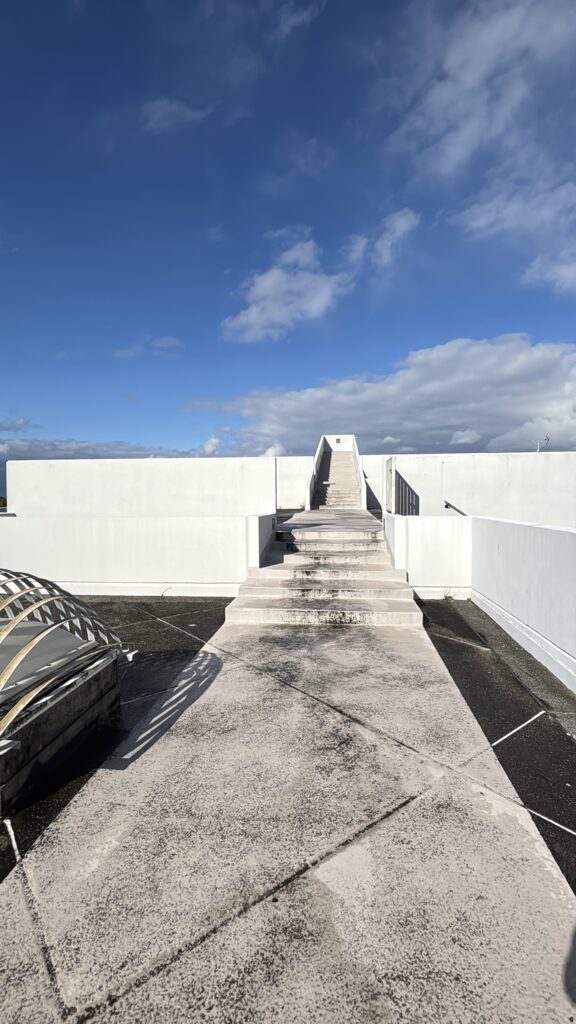 特に象徴的なのは、屋上へと続く**「天へと昇る階段」**です。この階段を一段ずつ登る行為は、視界を次第に空へと開き、日常の喧騒から精神を解放する儀式のようでもあります。また、壁面に埋め込まれた**琥珀色のガラス瓶**は、無機質な壁に温かな光を灯し、訪れる人々を優しく迎え入れます