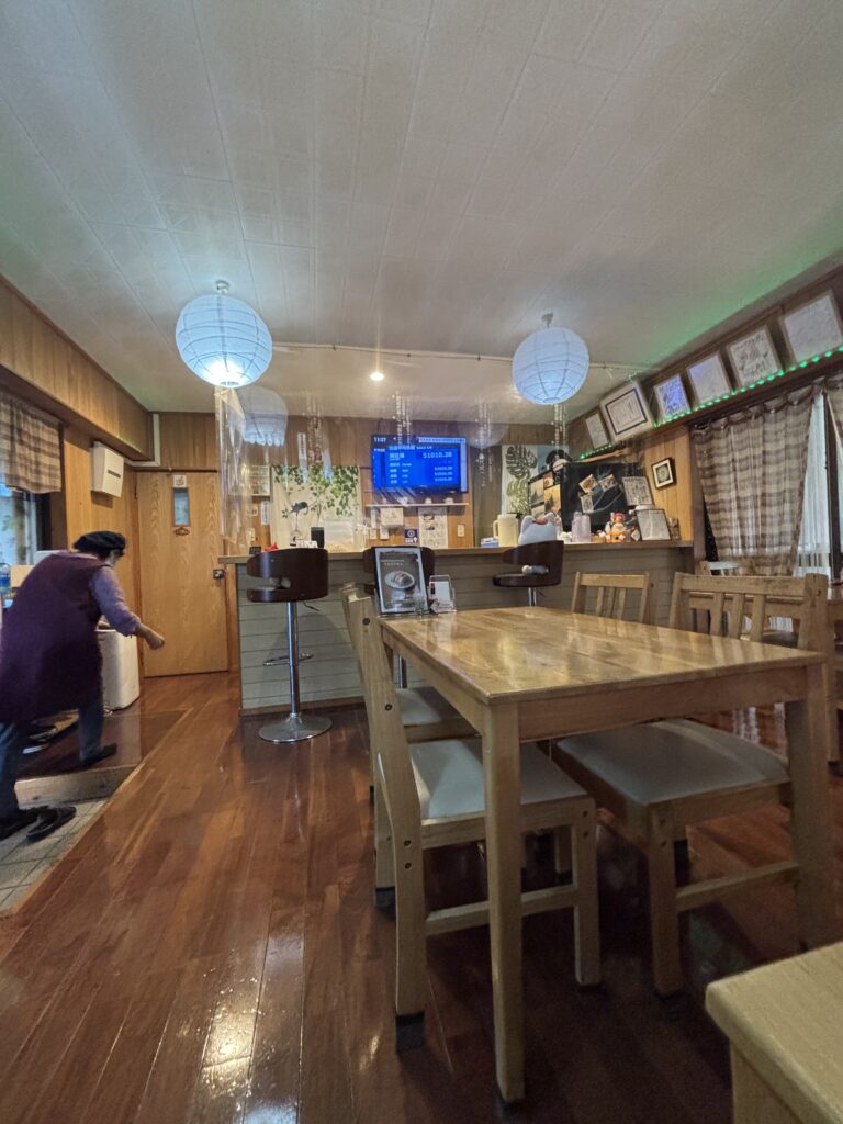 木を基調とした店内は、清潔感があり、アットホームな雰囲気が漂っています 。カウンター席やテーブル席があり、地元の人から観光客まで、誰もがゆったりと食事を楽しめる空間です 。