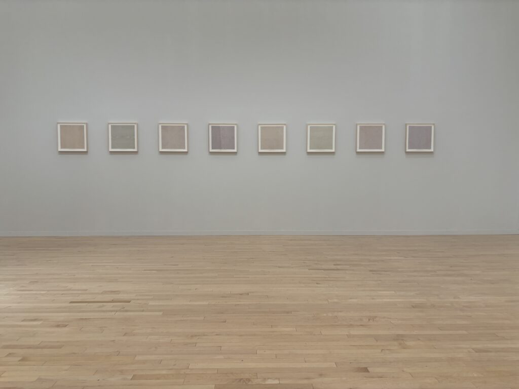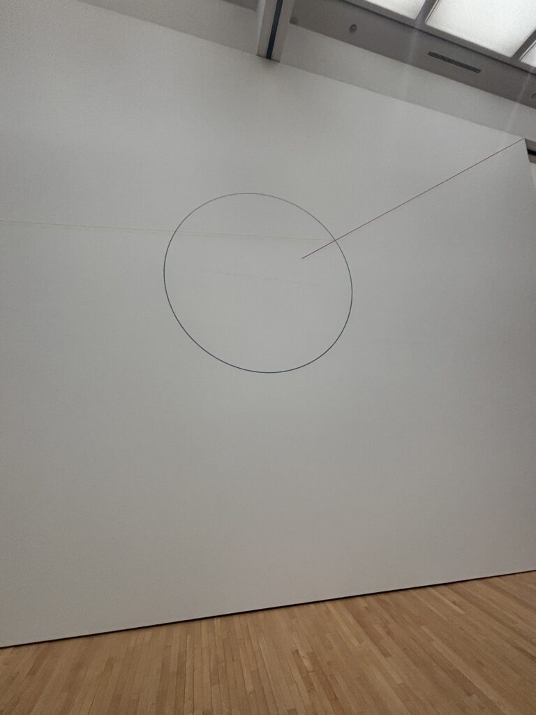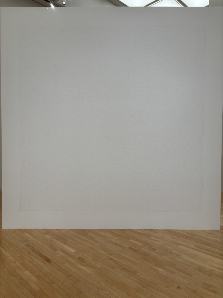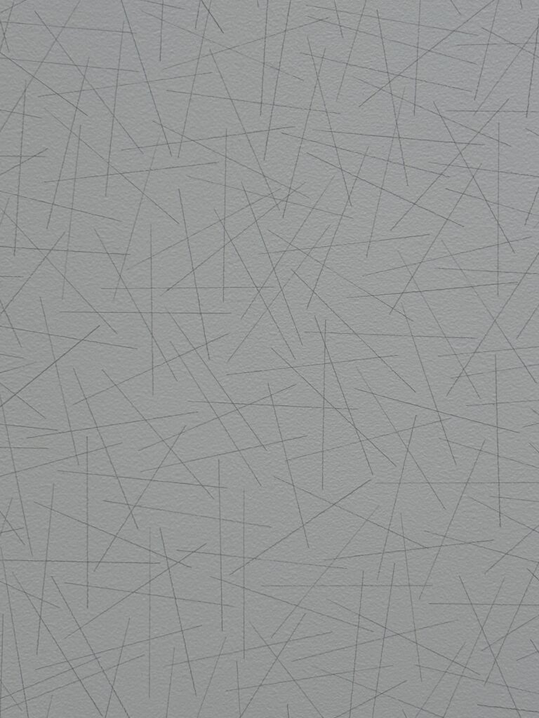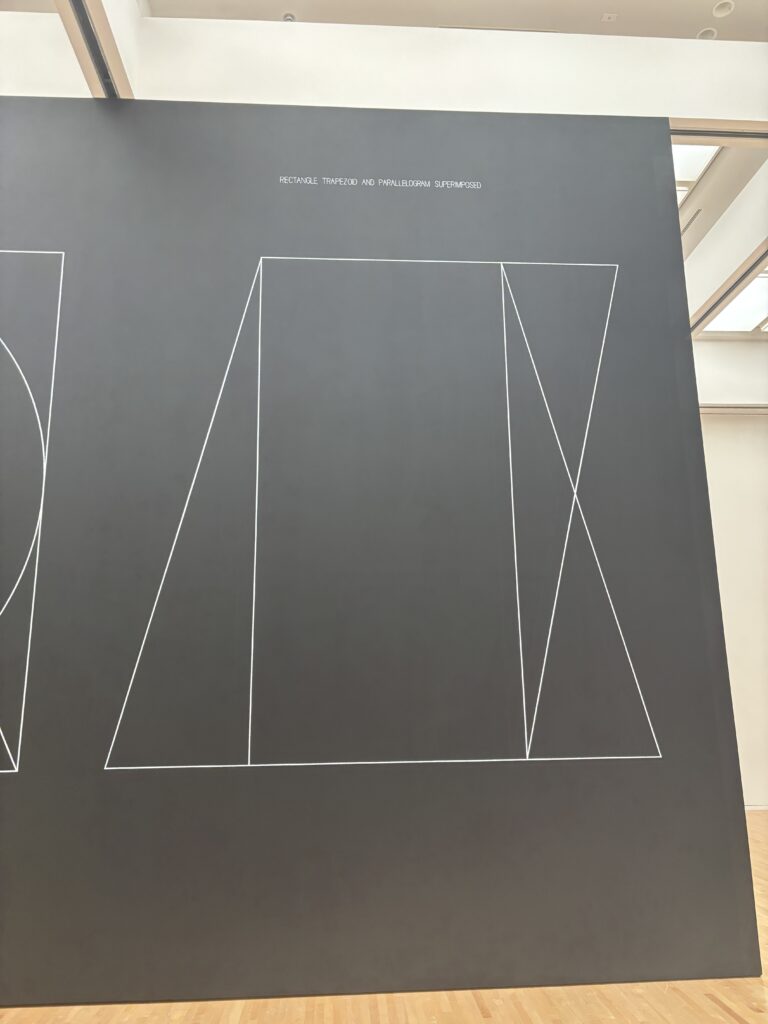 さらに進むと、壁一面に描かれたダイナミックな**ウォール・ドローイング**が目の前に現れます [1], [7]。驚いたのは、これらがルウィット自身の指示のもと、**他の人の手によって描かれている**という点です [1]。色鮮やかな幾何学模様や、黒い壁に引かれた繊細な白い線——それらは「芸術とは何であるか」という問いを、静かに投げかけてくるようでした [1], [7], [8]。